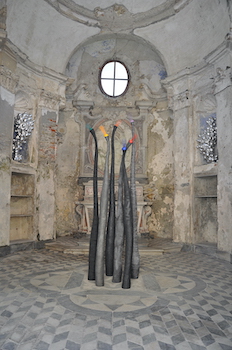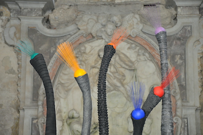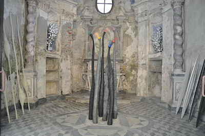 Tra le opere più significative, "effusori" domina lo spazio monumentale della Cappella. Questa creazione maestosa, composta da elementi unici con superfici diverse, rappresenta la diversità specifica di ogni individuo appartenente alla stessa specie. Il colore nero degli elementi è interrotto da "effusori" colorati, simboli del desiderio di comunicare affettività e relazionalità.